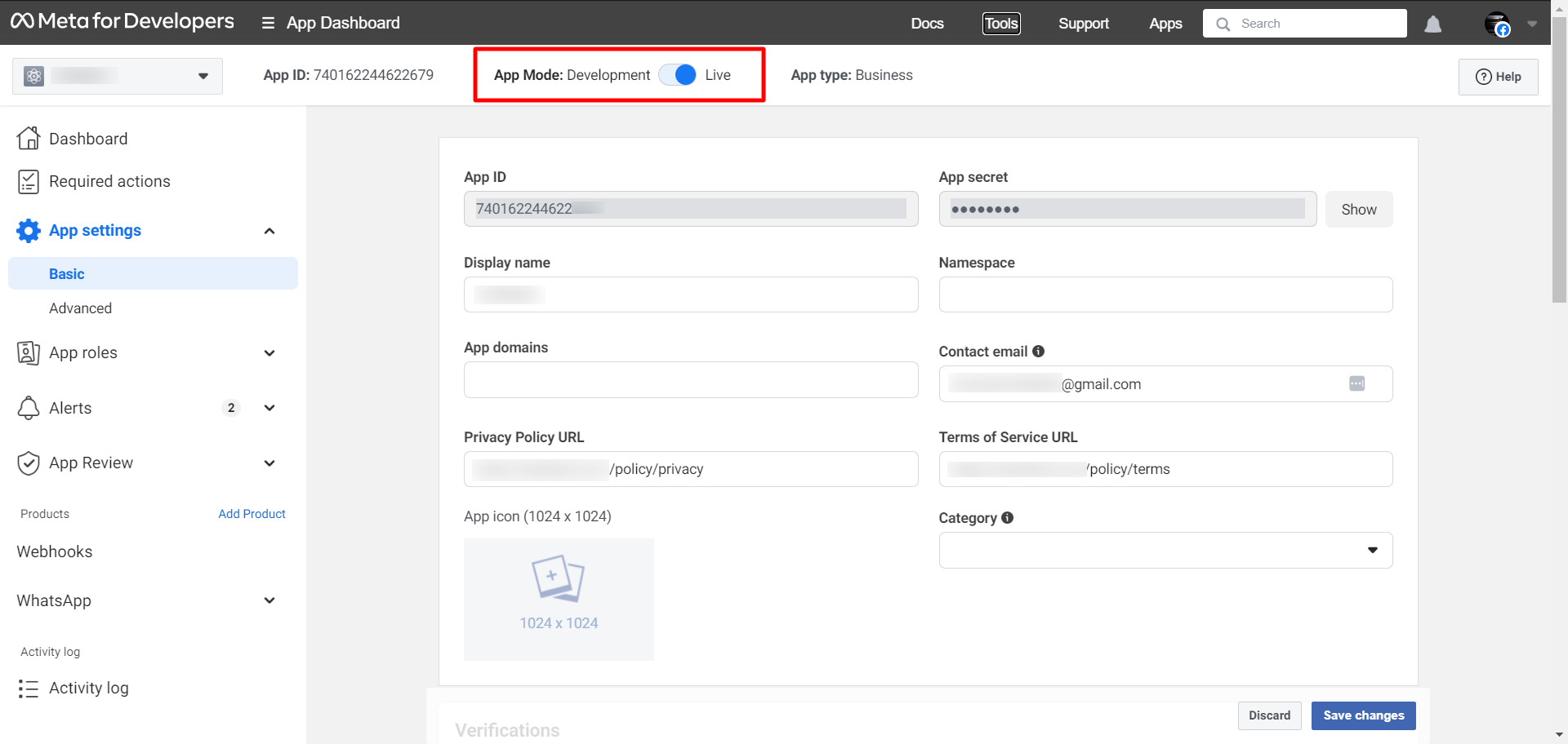 Then from the App settings, click on the Basic option and add the Privacy Policy URL and Terms of Service URL from the AfterSale. These URLs are available on the Connect bot page of AfterSale. After adding these URLs just click on the “Save changes” button.
